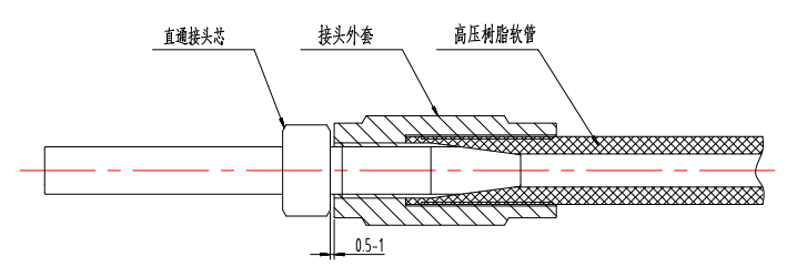 2) 把直通接頭芯從接頭外套的另一端順時針旋入,二者之間留有 1mm 左右間隔,如圖所示。為便于安裝,可在接頭芯前段表面沾一點油或脂。